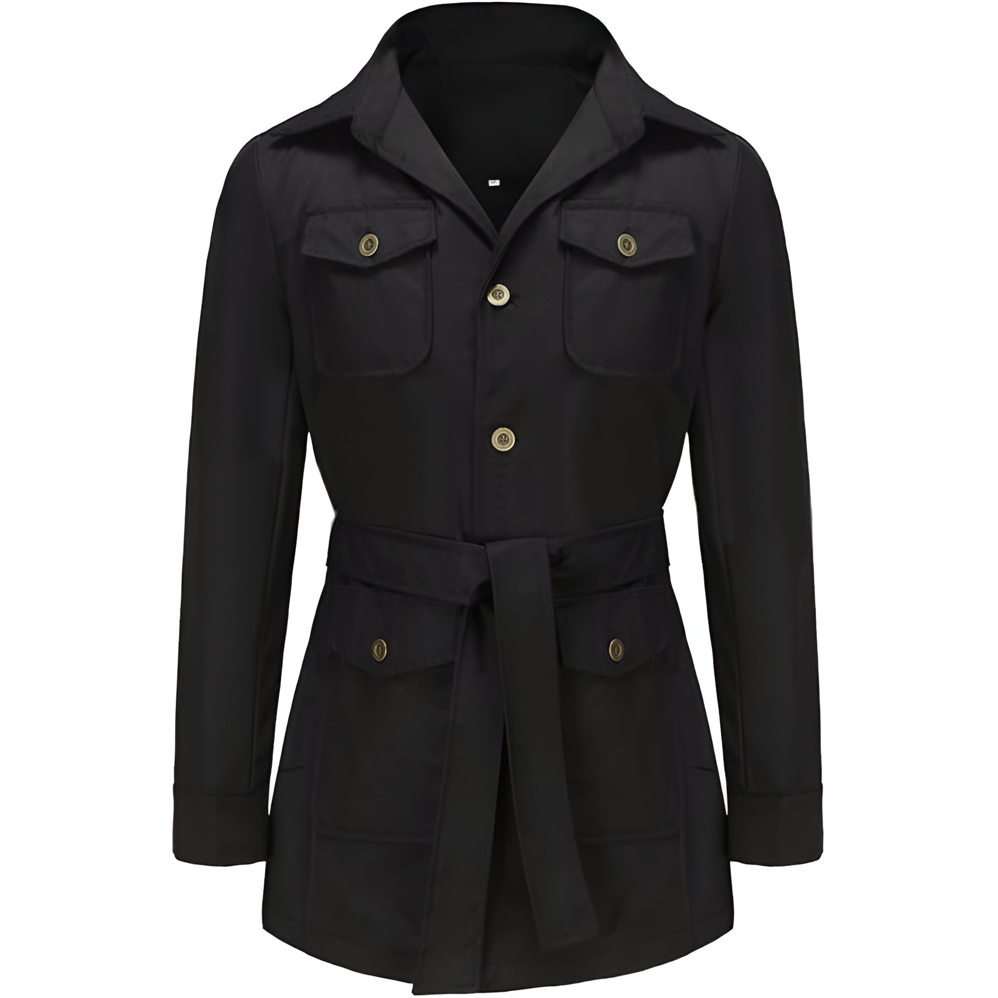 This men’s belted field jacket combines utility design with timeless military and safari inspiration. Built with multiple front pockets, a structured collar, and an adjustable waist belt, it delivers both practicality and refined style. Perfect for outdoor activities, work, or casual city wear, this jacket offers durability and versatility throughout the autumn and winter seasons.