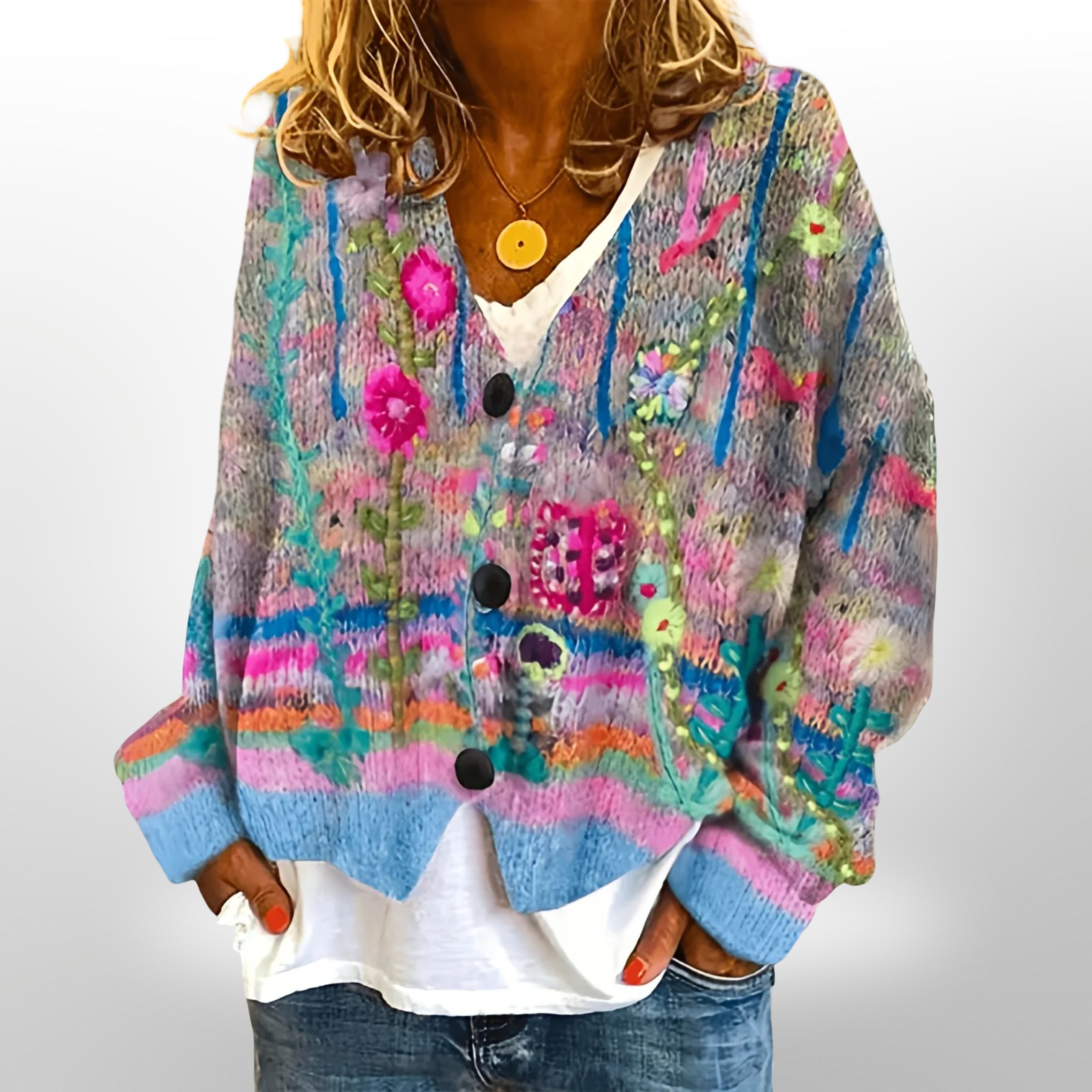 This oversized knitted cardigan adds bold charm to your everyday style. Designed with a cropped length and detailed floral knit, it’s soft, cosy, and made to stand out. The relaxed fit makes it perfect for layering over simple tops and jeans, while the textured flower patterns bring a handmade, artistic feel to your wardrobe.