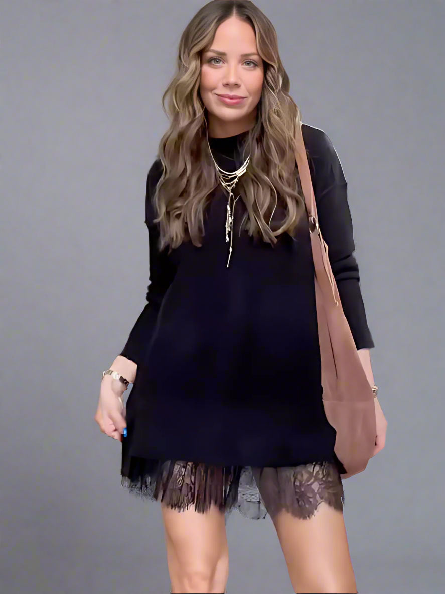 This knitted long sleeve dress set offers a perfect mix of cozy comfort and refined elegance. Crafted from soft, flexible fabric, it features a delicate lace trim at the hem for a feminine touch. The mini length and coordinated set design make it easy to create a stylish look without extra effort, perfect for casual days, date nights, or semi-formal gatherings.